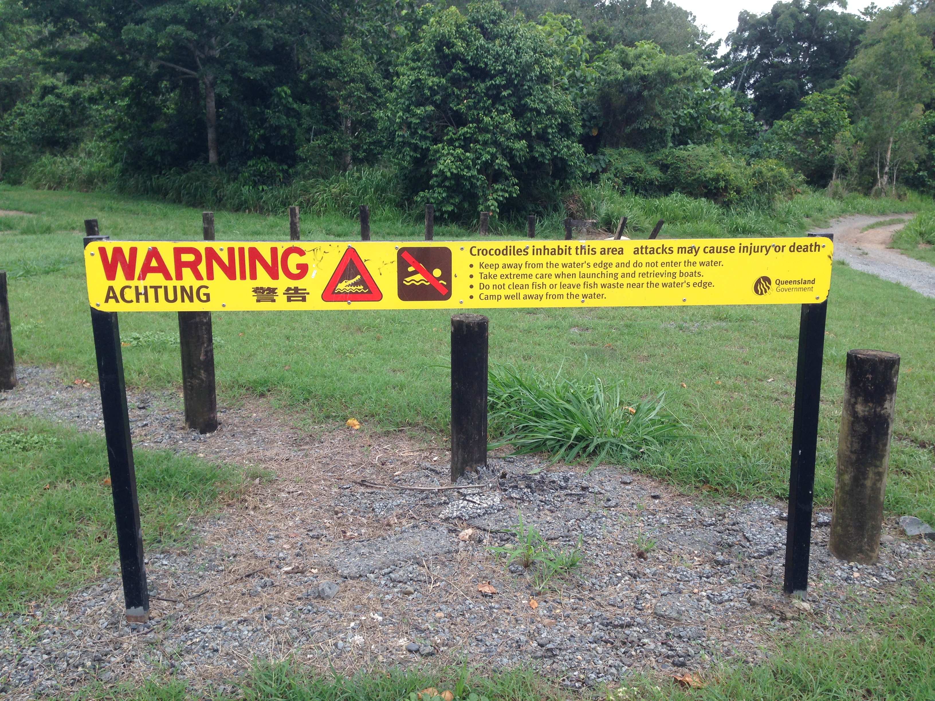 Nous rejoignons la côte après notre escapade dans les terres arides de l’Outback. Ici, c’est le territoire des crocodiles marins et à chaque fois qu’on passe au dessus d’une rivière, un gentil panneau est là pour nous le rappeler. On trouve aussi ces sales bestioles de 5m de moyenne sur les plages à proximité des embouchures de fleuves…