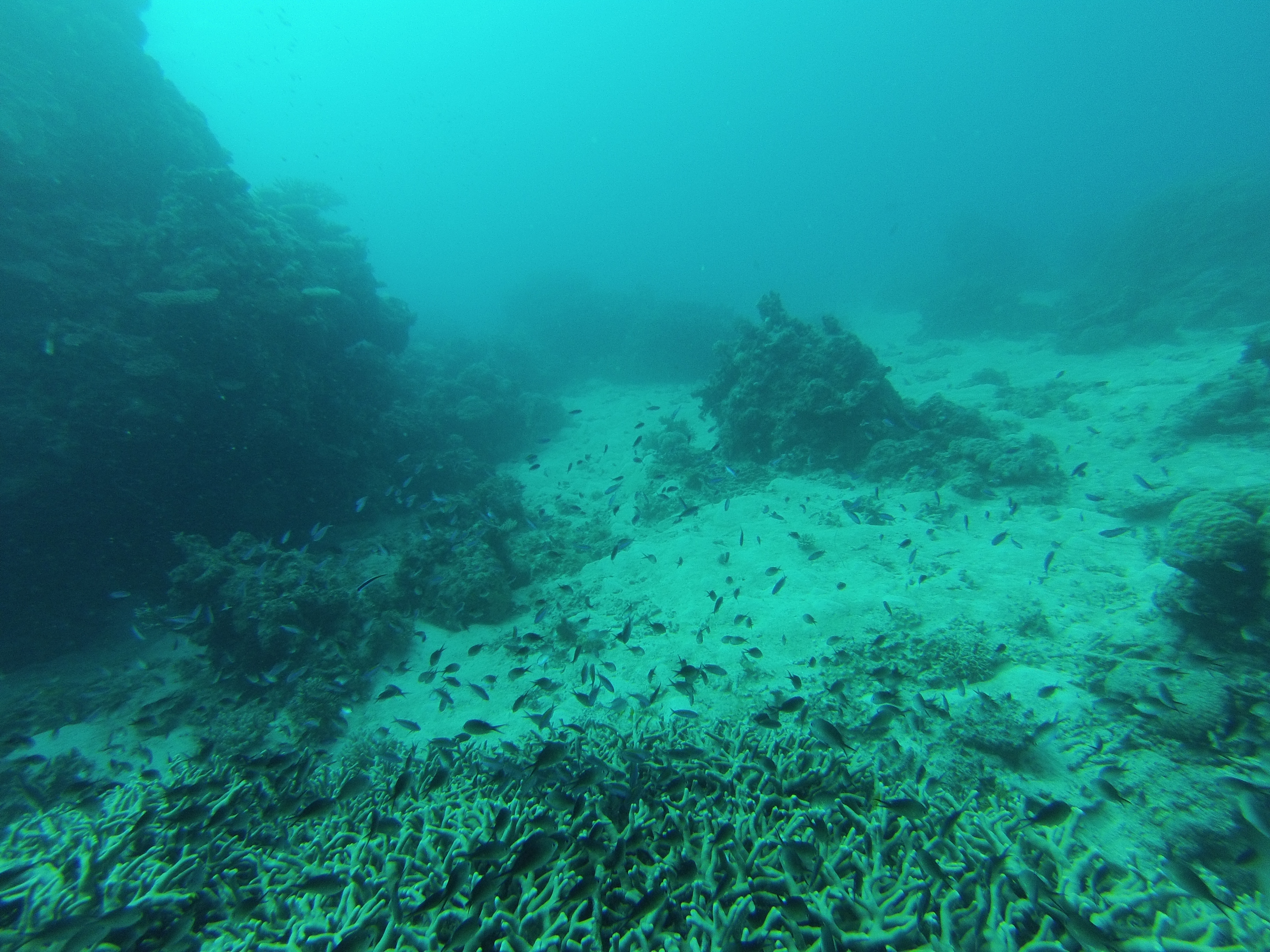 Après le repas, nous partons sur le site des Three sisters, des sortes de grandes cheminées coralliennes posées sur un tapis sablonneux. De beaux bancs de poissons nous y attendent ainsi que de superbes gorgones.