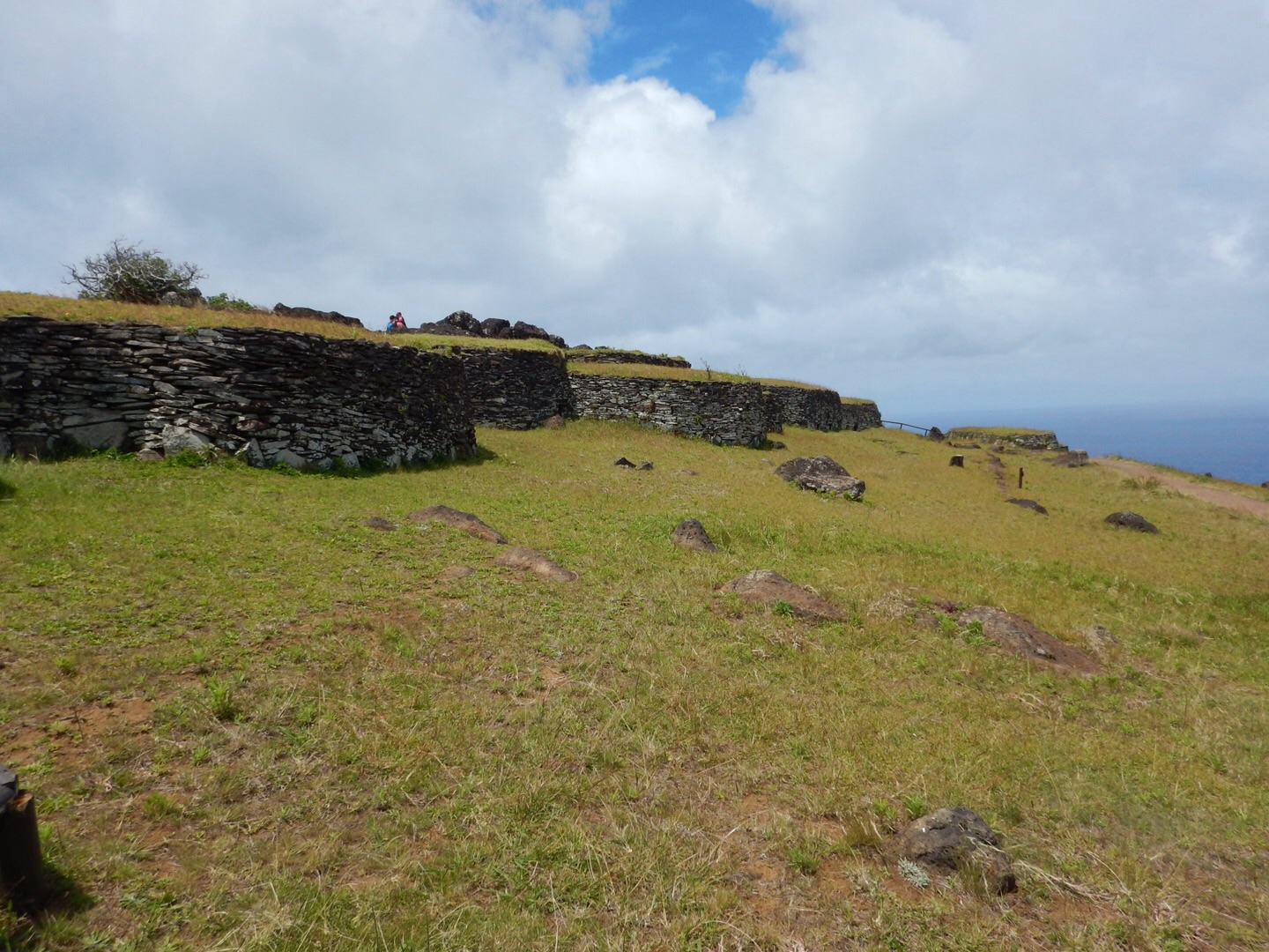 Sur son coté, se trouve l’ancien village cérémoniel d’Orongo. Les maisons de pierre étaient construites en forme de bateaux retournés et orientés en fonction du vent terrible qui souffle ici. Les cultures étaient faites dans des cercles de pierre afin de les abriter.