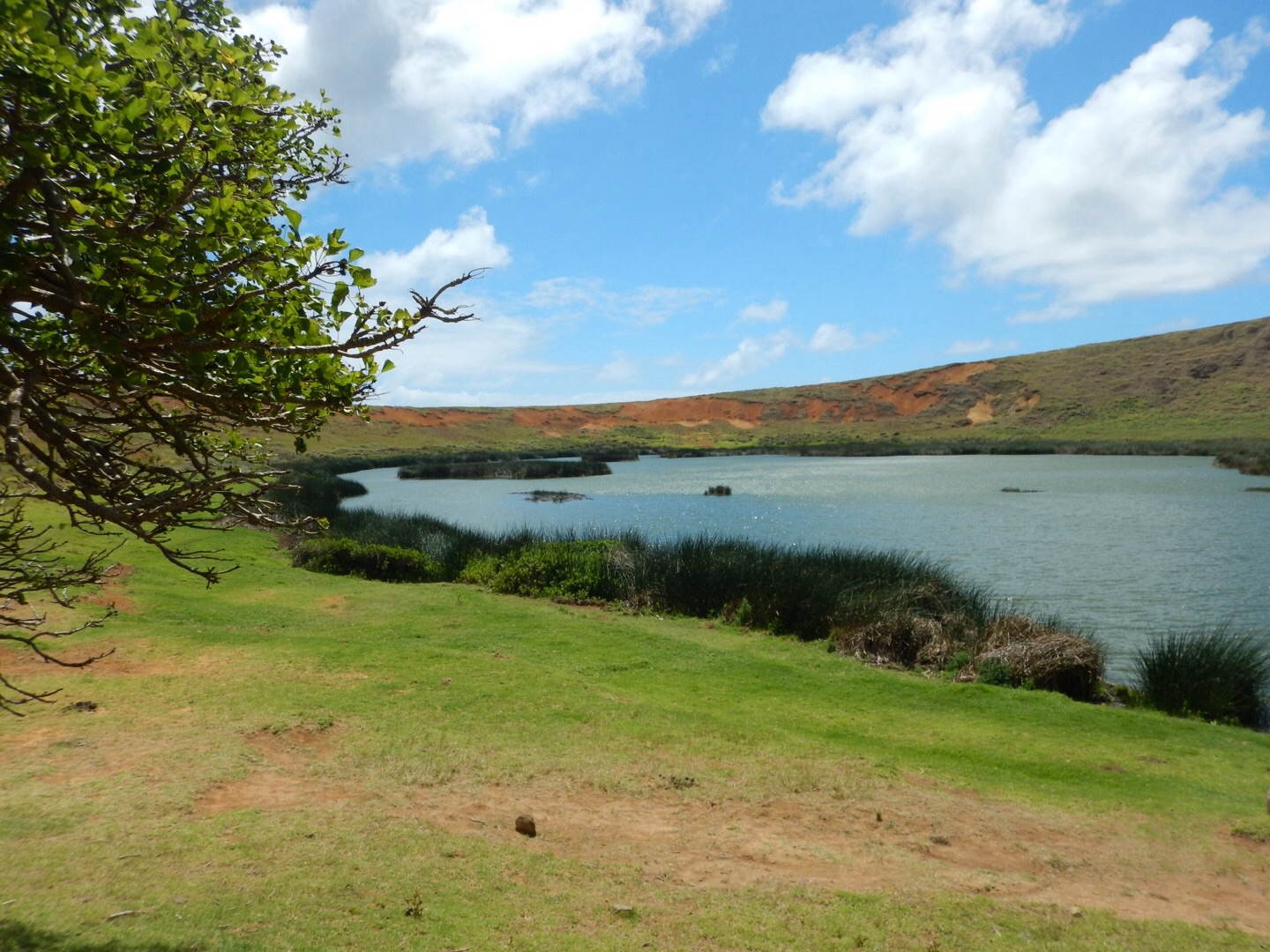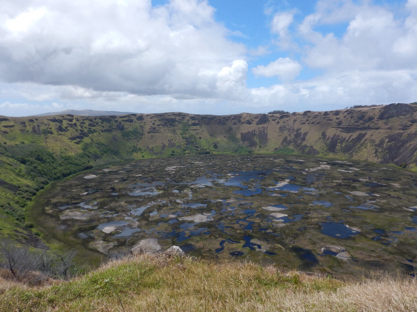 Dès le lendemain de notre arrivée, nous partons à la découverte des environs. Au sud de l’île, à quelques kilomètres de l’unique ville d’Hanga Roa, se trouve le cratère Rano Kau. L’histoire volcanique est visible partout, de nombreux anciens volcans parsèment le paysage très vert et la roche noire déchirée se jette dans une mer d’un bleu profond. Le cratère circulaire parfait laisse découvrir en son fond un marécage à la flore endémique exceptionnelle. C’était aussi pour les premiers habitants, la seule source d’eau douce accessible.
