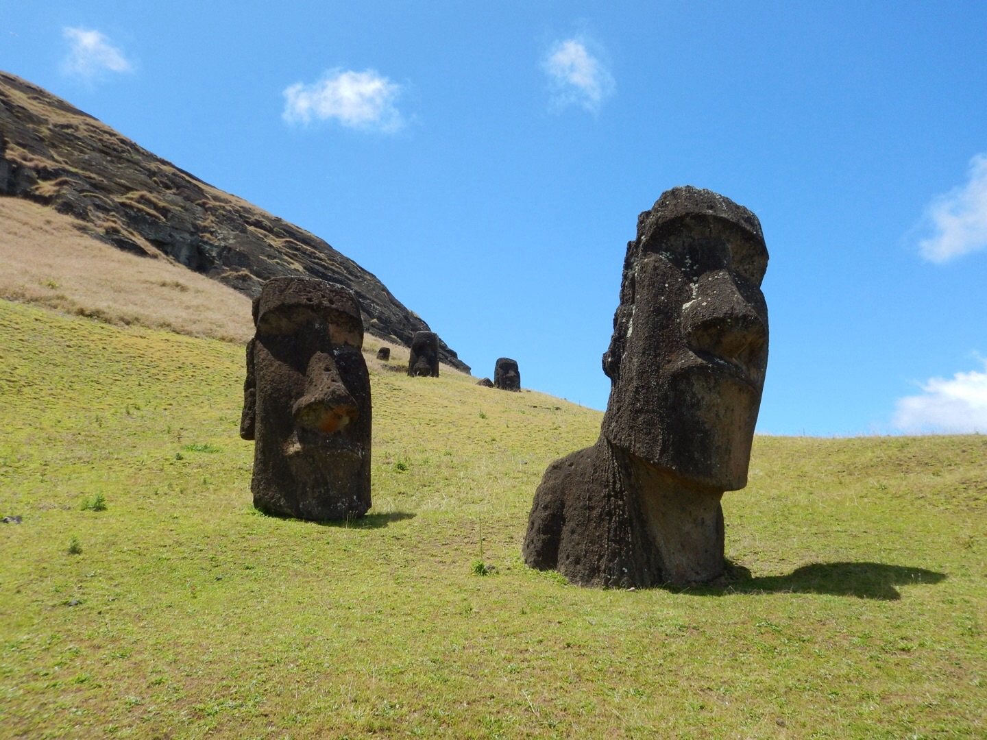 Nous visitons le site de Rano Raraku (aussi appelé « l’usine à moai ») où les moais étaient fabriqués. C’est ici que se trouve la plus grande concentration de moais de l’île. On y trouve aussi le plus grand qui mesure près de 20m de haut.