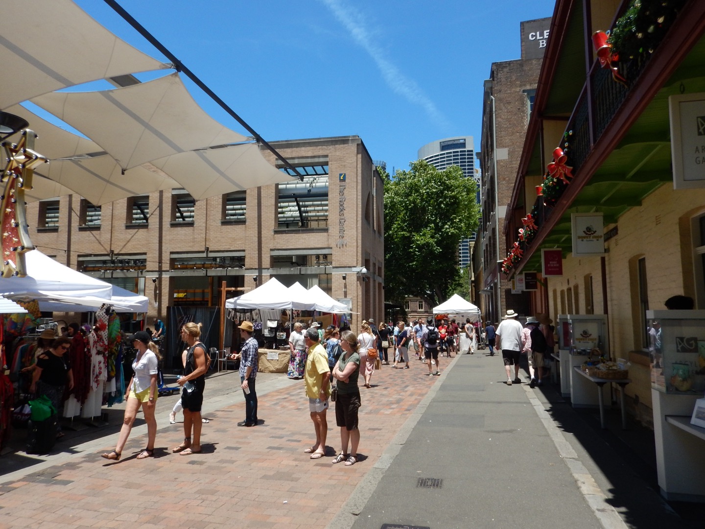 Ensuite, nous nous baladons dans le quartier historique The Rocks où s’établirent les premiers colons. Aujourd’hui, c’est un quartier très « bobo » où on trouve de nombreux restaurants, bars et boutiques. Et comme c’est dimanche, nous avons la chance de pouvoir voir le marché.