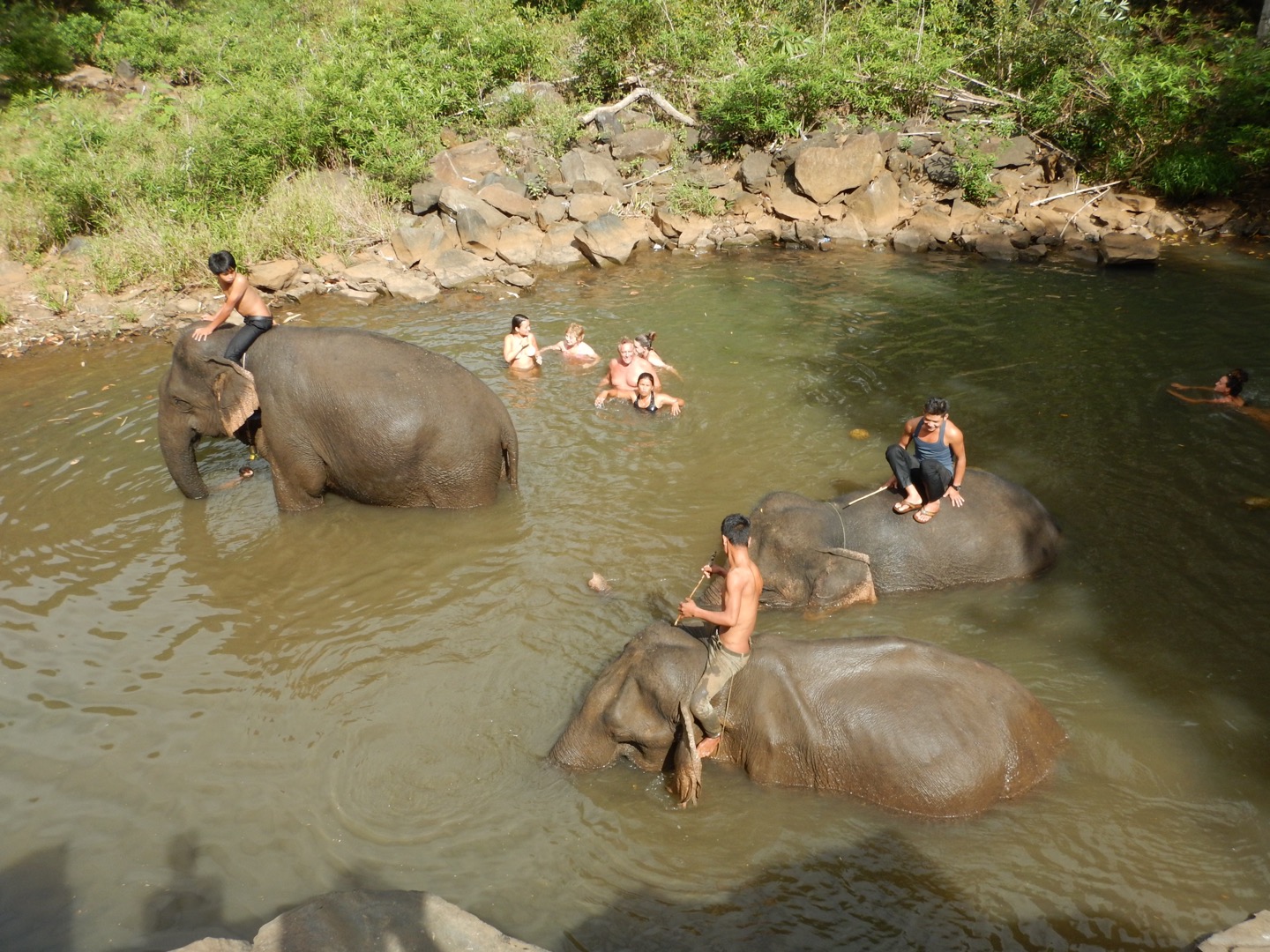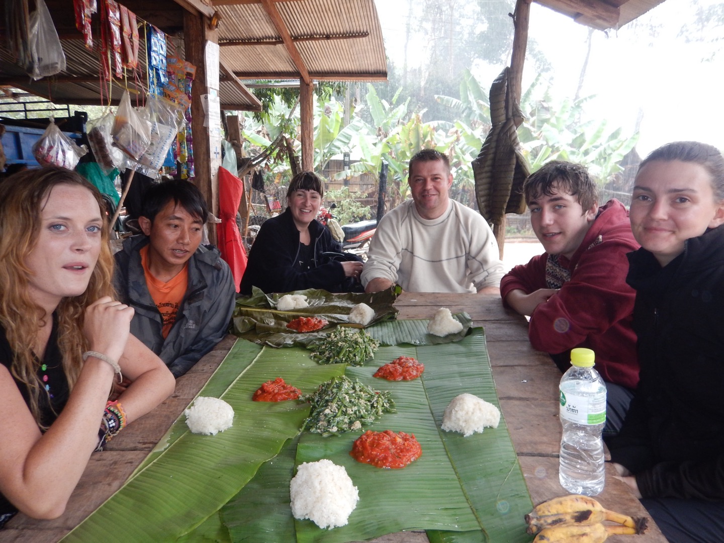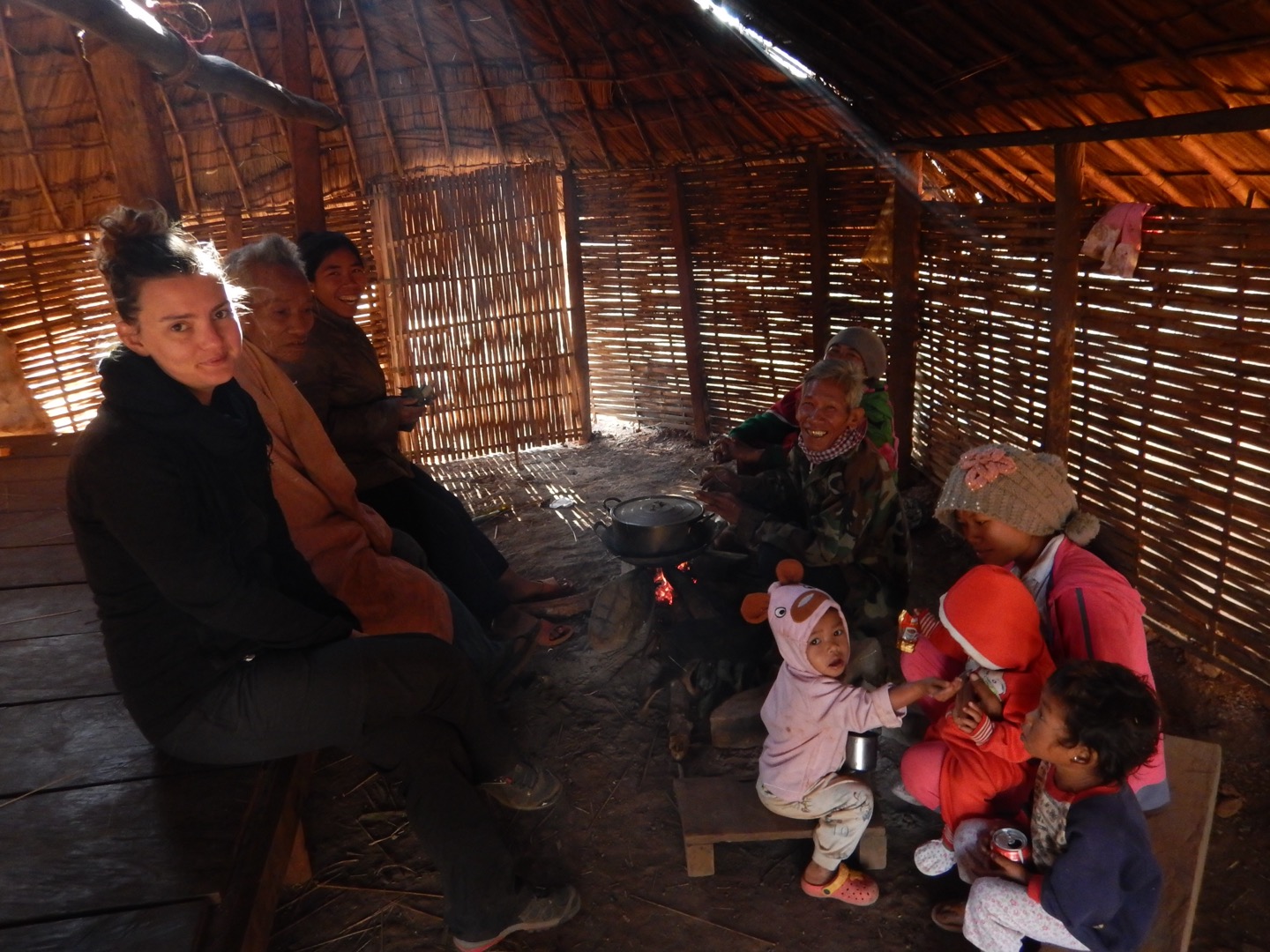 Le soir, nous mangeons le coq choisi (et tué…) par notre guide dans la basse cours, il est accompagné des fameuses pousses de bambous, de courges, et d’étranges fruits au goût très épicé ou très fromagé… On discute comme on peut avec la famille, on leur montre des photos de notre voyage. Ils sont fascinés par les villes occidentales. Nous buvons du lao-lao avec eux, un alcool de riz maison très très fort.